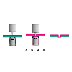 無鉚釘鉚接是一項鈑件沖壓鏈接核心技術。采用氣液增壓缸式沖壓設備和專用的標準連接模具,利用鈑材材料本身的塑性變形,通過一個沖壓過程,即可在連接處形成一個互相鑲嵌的圓點,由此將鈑件連接起來。該鉚接點不損傷工件表面的鍍層或漆層,連接點保持鈑件原有的抗腐蝕性。